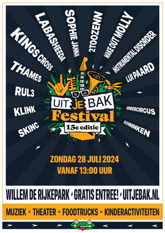 In 2024 vierden we voor het vijftiende jaar Uit Je Bak Festival. In 2007 was de eerste editie van het festival, toen nog buiten bij het oude pand van De Bakkerij aan het Bakkerspleintje. Het jaar daarop gingen we naar parkeerplaats De Brink. Omdat het pand van De Bakkerij werd gesloopt. De Brink bleek geen perfecte locatie waardoor we in 2009 verhuisden naar onze huidige locatie in het Willem de Rijkepark. De jaren erna werd er steeds een schepje bovenop gedaan waardoor het festival uitgegroeid is naar het drukke, gezellige, zonnige en gevarieerde festival wat het nu is!